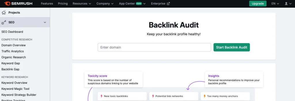 Step 1: Go to SEMrush and click on Backlink Audit.