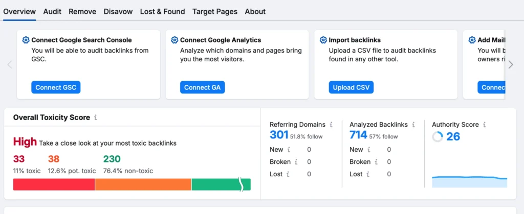 Once the audit is complete, SEMrush will categorize your backlinks into three levels of toxicity: