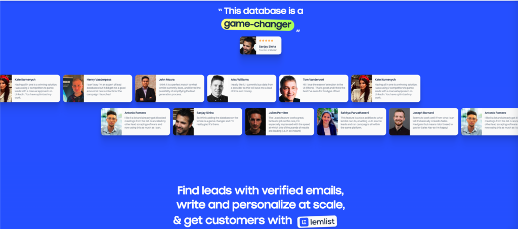 Take a look at this example from Lemist – another sales engagement software.They have creatively displayed their client testimonials within their “b2b lead database” feature page.