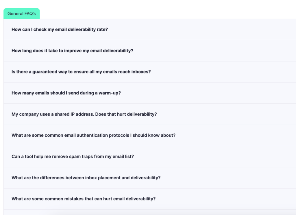 For example, Smartlead.ai makes the best use of the FAQ section in each of their product pages. In the feature page “premium email deliverability at scale”, they have answered numerous questions that their customers might have regarding the feature or product.
